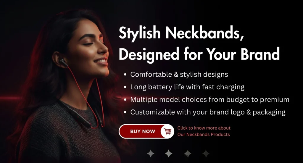Get customized earbuds & neckbands with your brand name, packaging, and Bluetooth identity. Fill out the form and our team will contact you shortly.